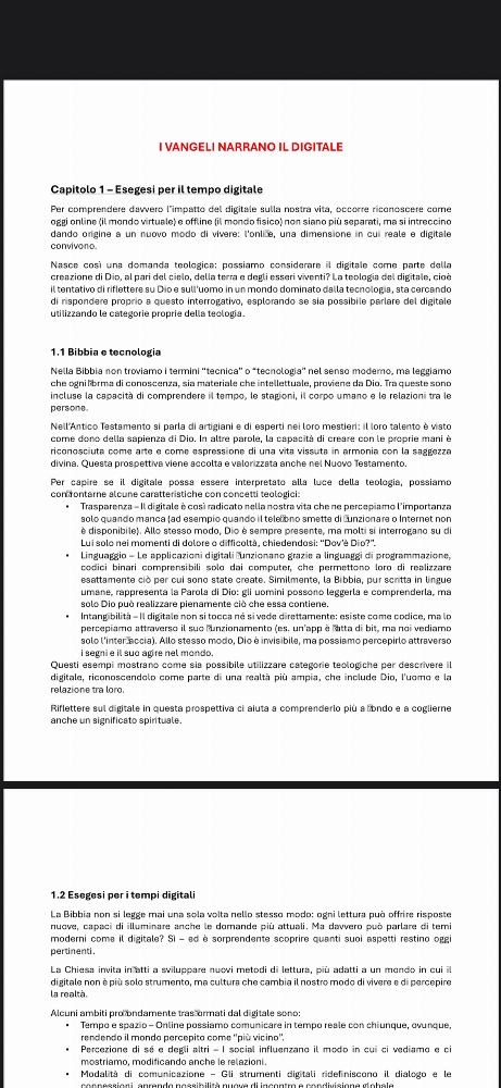 Dispensa utile per il superamento dell'esame seminariale di teologia con indirizzo etico culturale di Luca Peyron. Contiene tutte le informazioni rilevanti dei libri: I VANGELI NARRANO IL DIGITALE (I e II), INCARNAZIONE DIGITALE (completo) E ENCICLICA LAUDATO Sì (102-114), come richiesto da programma per non frequentanti. Voto esame 30 ottenuto studiando esclusivamente da questi appunti.